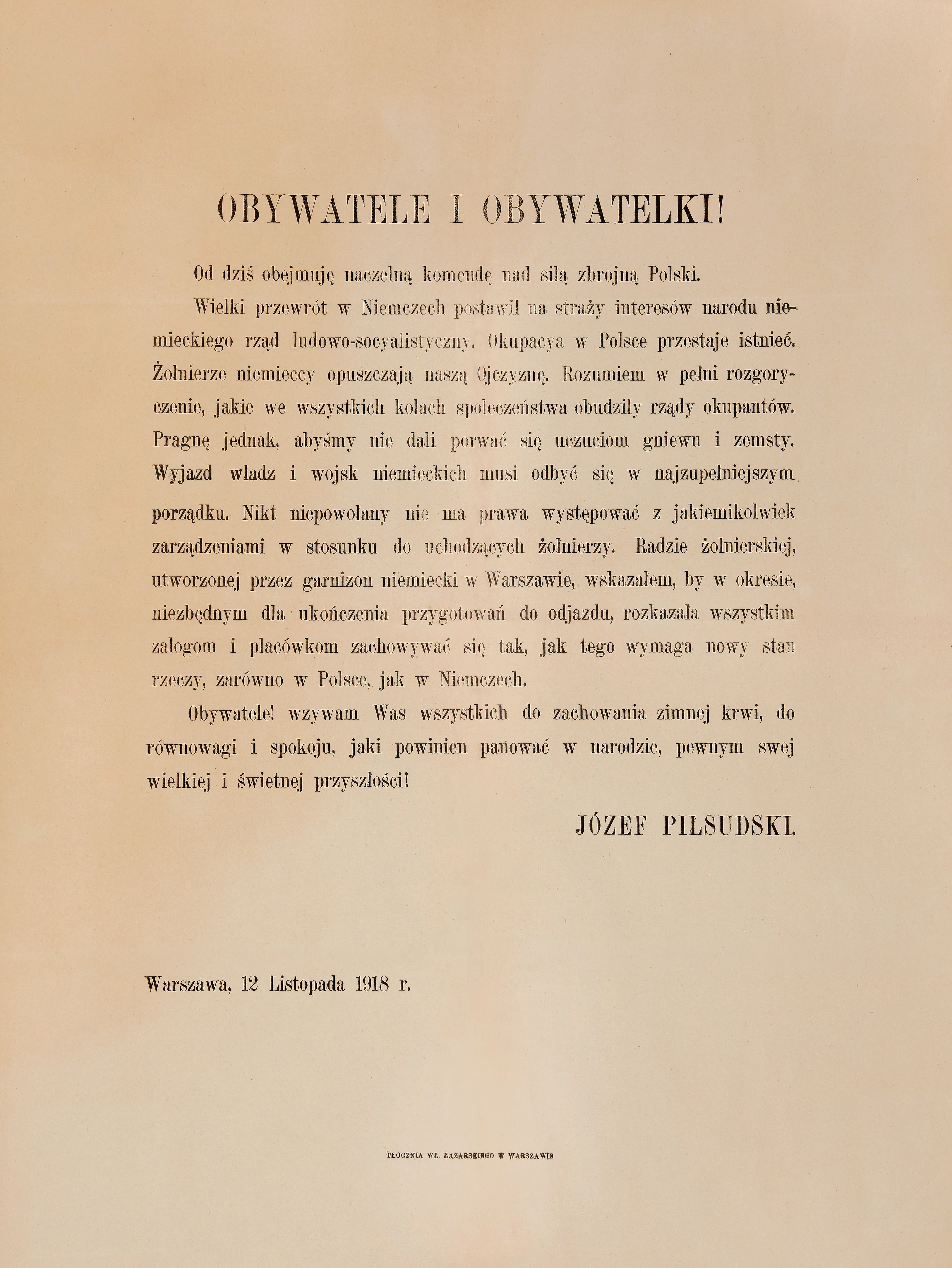 W marcu 1918 roku rząd bolszewików, powstały w wyniku rewolucji w Rosji, podpisał z państwami centralnymi traktat pokojowy w Brześciu, wycofując tym samym Rosję z Wielkiej Wojny. W pierwszych dniach listopada, w obliczu przegranej wojny i kryzysu gospodarczego, marynarze i robotnicy niemieccy rozpoczęli rewolucję. Dnia 9 listopada cesarz Wilhelm II abdykował, a Philipp Scheidemann – polityk Socjaldemokratycznej Partii Niemiec – ogłosił powstanie Republiki Niemieckiej. Brygadier Józef Piłsudski został uwolniony z więzienia w Magdeburgu i specjalnym pociągiem wyjechał do Warszawy, gdzie przybył 10 listopada. Następnego dnia oddziały niemieckie zostały rozbrojone na warszawskich ulicach, a Piłsudski przejął od Rady Regencyjnej – organu władzy powołanego w 1917 roku przez niemieckie i austro-węgierskie władze okupacyjne – dowództwo nad wojskiem polskim. Wydał wówczas odezwę do mieszkańców odradzającej się Polski, komunikowaną również za pomocą afiszów – jak w przypadku prezentowanego egzemplarza w formie pojedynczej karty z sygnaturą drukarni u dołu. Treść odezwy głosi: