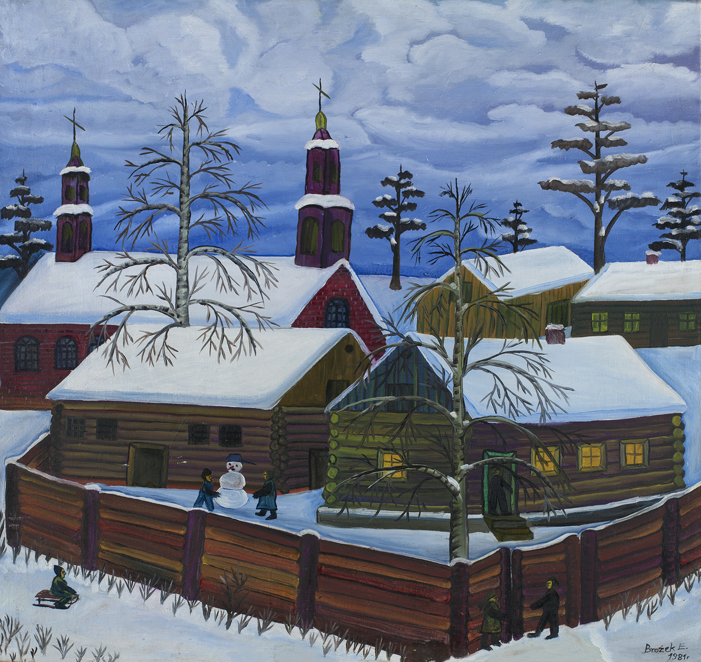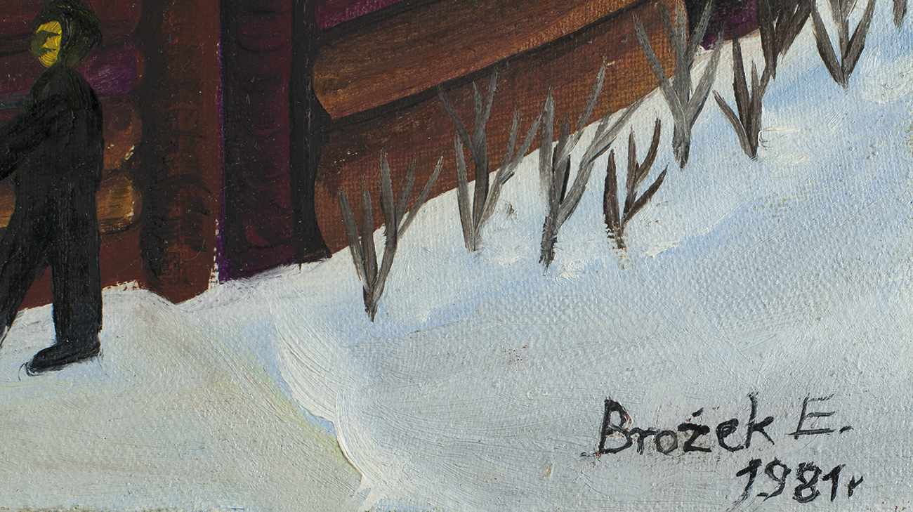 rodzinnej wsi artysty, a w tle wznosi się kościół z pobliskiego Mstyczowa. Spadziste dachy pokrywa warstwa puchowego śniegu, a przez szyby okien przebija ciepłe, złote światło. Gdy uważniej się przypatrzymy, dostrzeżemy wokół domów ich mieszkańców. Dzieci z zaangażowaniem lepią bałwana, ktoś zjeżdża na sankach, a przy bramie sąsiedzi toczą swobodną rozmowę. Te wszystkie detale sprawiają, że obraz nie jest jedynie statycznym widokiem, ale żywą sceną z życia wiejskiej społeczności, idealizowaną, lecz pełną prawdy o człowieku i jego związkach z naturą. Pamiętać trzeba, że Brożek nie odtwarzał rzeczywistości dosłownie, lecz umiejętnie wplatał realia w baśniowy pejzaż, tworząc go według własnej idealistycznej wizji. W ten sposób budował nie tylko obraz, ale także emocjonalny portret czasów, które były dla niego synonimem spokoju i harmonii.