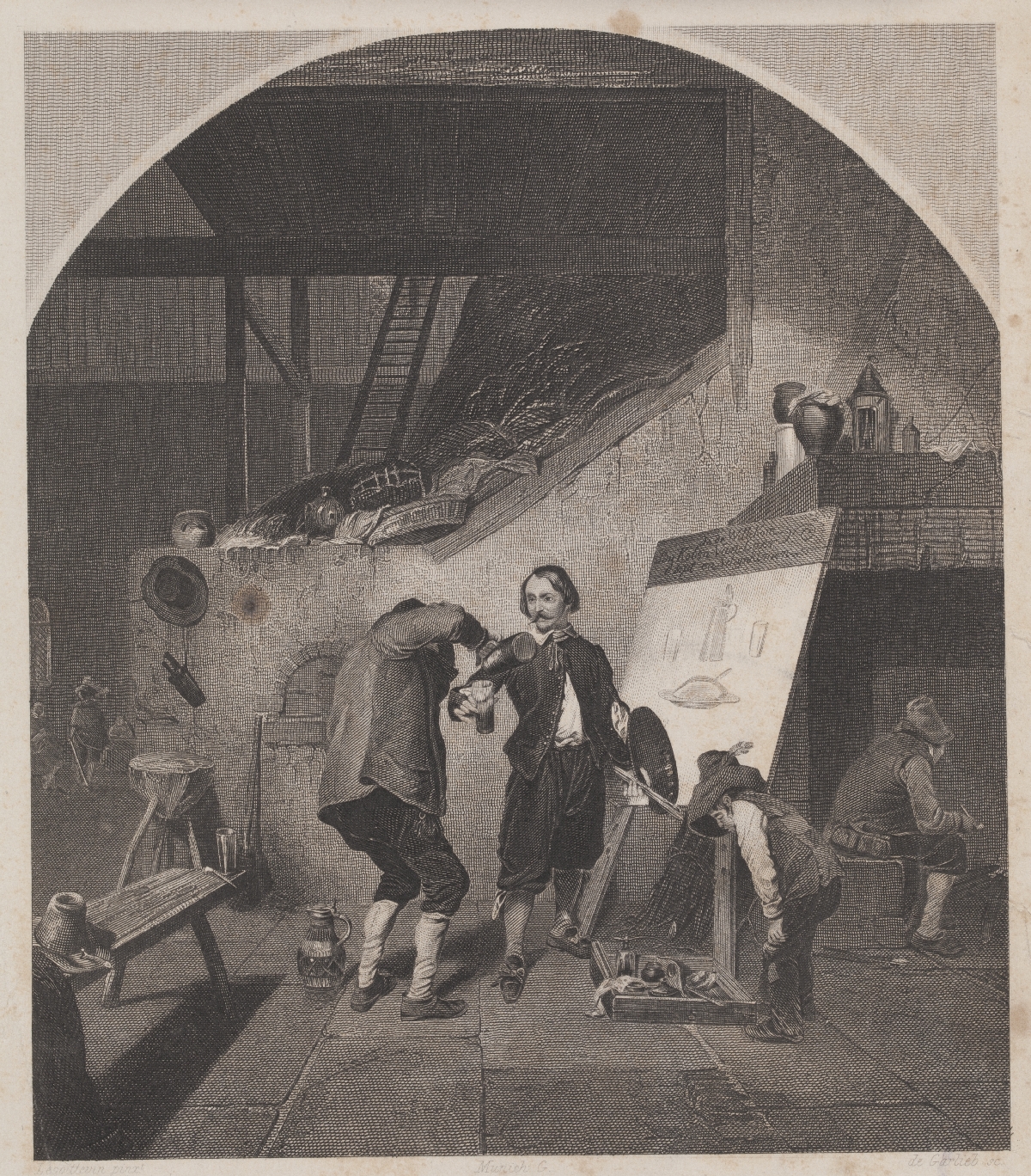 Scena powtórzona na rycinie ukazuje malarza w „pracowni” zorganizowanej w zajeździe. Mężczyzna stoi przy sztaludze z paletą w jednej, z kubkiem w drugiej dłoni. Spogląda na karczmiarza polewającego mu trunek. Obok chłopiec pochyla się nad skrzynką z przyborami malarskimi. Bohaterem przedstawienia, jak wskazuje tytuł pod kompozycją, jest flamandzki malarz Adriaen Brouwer (1605/6–1638), podejmujący w swoich pracach temat życia i rozrywek przedstawicieli niższych warstw społecznych – chłopów, żołnierzy bawiących się w tawernie lub wiejskim otoczeniu, w stanie upojenia alkoholowego, palących papierosy, grających w karty i kości.