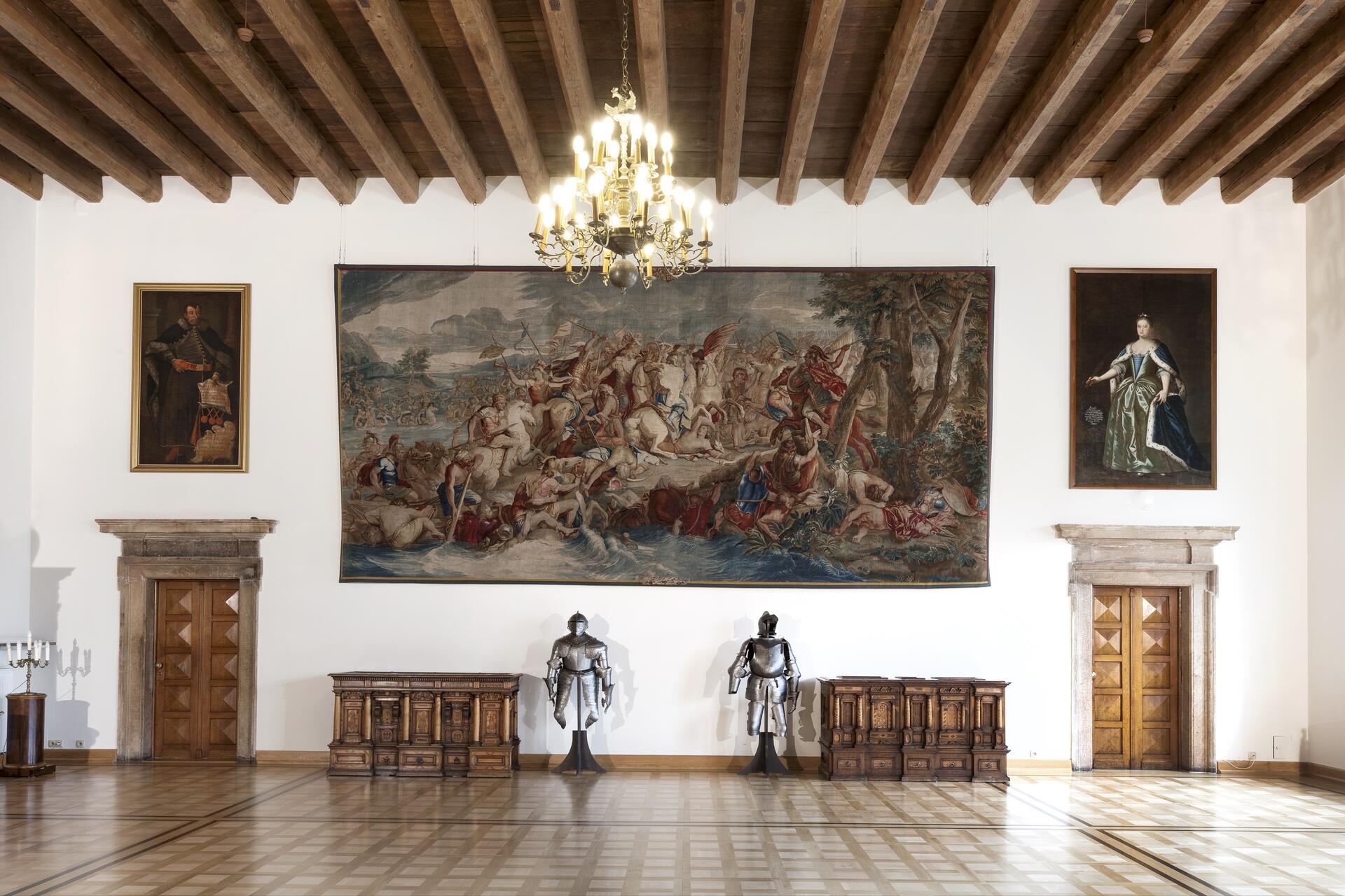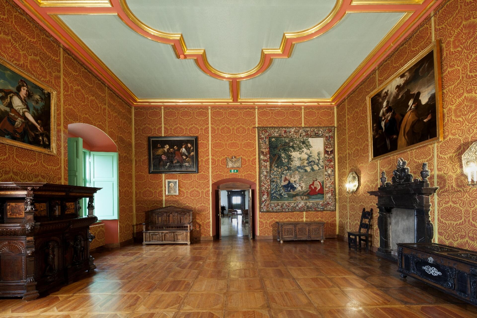 Pełnił funkcję antykamery. Goście oczekiwali tu na przyjęcie przez gospodarza pałacu. Do XIX wieku pokój zdobił strop ramowy ze scenami wojen polsko-moskiewskich i centralnym malowidłem przedstawiającym zawarcie traktatu pokojowego w 1634 roku. W 2. połowie XVII wieku ściany pokryte były kurdybanem (czyli skórą zdobioną tłoczonymi malowanymi bądź złoconymi wzorami). Sto lat później obito je tkaniną brokatową w karmazynowym kolorze, do której nawiązuje współczesne czerwonozłociste obicie, wzorowane na XVII-wiecznych tkaninach włoskich. Z pierwotnego wystroju zachowała się marmurowa oprawa kominka z herbem Korab oraz fragment posadzki marmurowej we wnęce podokiennej.