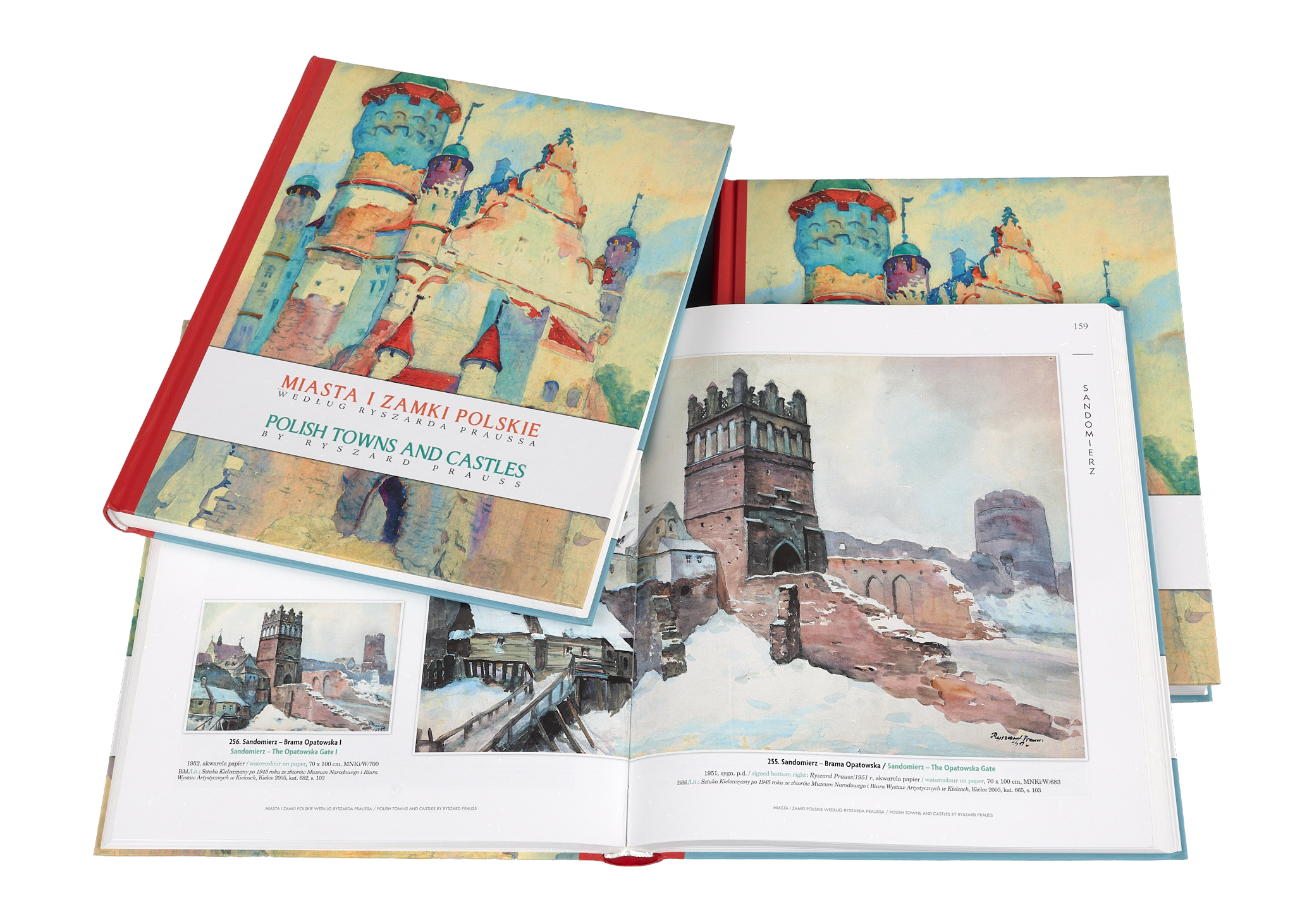 Dwujęzyczny polsko-angielski katalog prezentuje bogaty dorobek Ryszarda Praussa, obejmujący przedstawienia 42 miejscowości – od Baranowa Sandomierskiego po Ziębice, ze szczególnym uwzględnieniem znanych miejsc regionu, w tym Kielc. Publikacja ukazuje zarówno realistyczne widoki miast i zabytków, jak i fantazje architektoniczne artysty: baśniowe zamki inspirowane estetyką opowieści braci Grimm, tworzone na podstawie istniejących lub udokumentowanych budowli.
